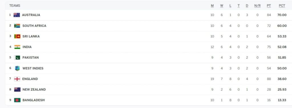ऑस्ट्रेलिया इस टेबल में 76.92 प्रतिशत के साथ लीड कर रही है। वहीं, दूसरे नंबर पर टीम इंडिया है, इंडिया के इस टेबल में 58.93 प्रतिशत अंक हैं। इसके बाद नंबर तीन पर 54.55 पॉइंट्स प्रतिशत के साथ साउथ अफ्रीका की टीम भी टीम इंडिया के लिए काफी टक्कर नज़र आ रही है। वही पर श्रीलंका के पास 53.33 पॉइंट्स प्रतिशत है जिसके चलते टीम चौथे स्थान पर नज़र आती है।